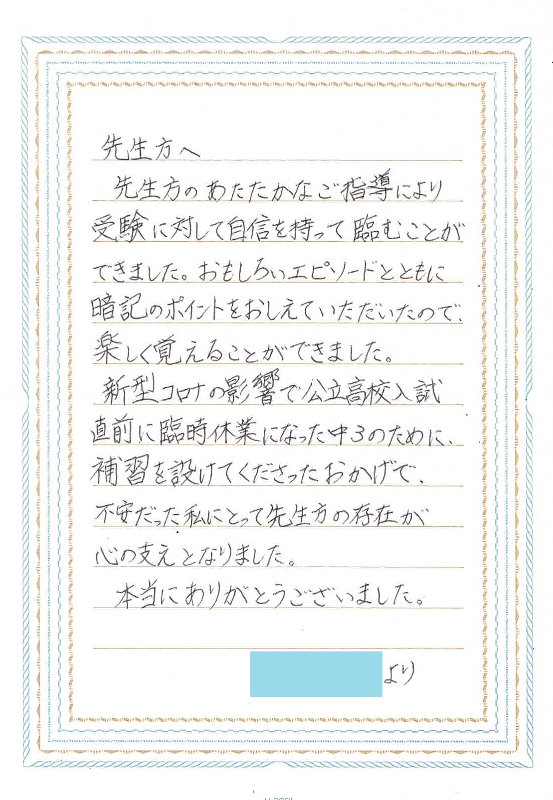 高校入試が終わり、卒塾にあたり、 塾生から手紙をもらうことがあります。 言葉で直接伝えてもらうのも もちろんうれしいですが、 手紙はまたちょっと違ったうれしさがありますね。 今年も卒塾する塾生から手紙をもらいました。 ![]() 手紙を書くのってハードル高いですよね。 そこがわかっているから、なおさらうれしい。 本当にありがとう。 素晴らしい高校生活になりますように。 心から祈ってます。 (掲載許可をもらっています) |